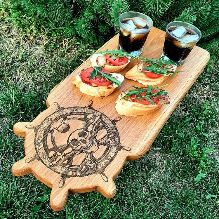 Dębowa deska do podawania przekąsek z unikalnym grawerem marynistycznym (kotwica, róża wiatrów).