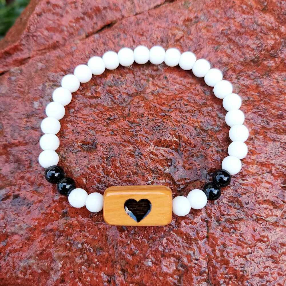 Podaruj sobie lub bliskiej osobie symbol piękna, który niesie ze sobą spokój i dobrą energię. W polskiej pracowni Nela Wood wierzymy, że biżuteria powinna być czymś więcej niż ozdobą. Nasza ręcznie robiona bransoletka z kamieni naturalnych to starannie przemyślana kompozycja białej ceramiki, głębokiego czarnego onyksu oraz szlachetnego drewna oliwnego. Centralnym punktem jest drewniany koralik z ręcznie wypalonym motywem serca – symbolem miłości i autentyczności, który sprawia, że każdy egzemplarz jest absolutnie jedyny w swoim rodzaju.