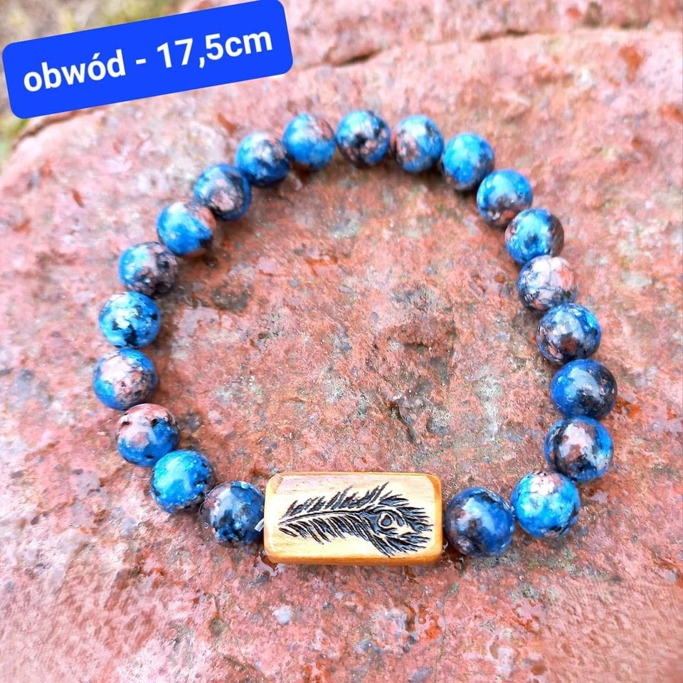 Centralnym elementem bransoletki jest koralik wykonany z drewna oliwnego, na którym techniką pirografii został wypalony detaliczny wzór pawiego pióra. Drewno to symbolizuje trwałość i piękno, a jego naturalne właściwości gwarantują, że będzie służyło Ci przez lata.