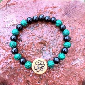 Bransoletka Mocy: Naturalny Malachit, Onyks i Grawerowane Drewno Oliwne