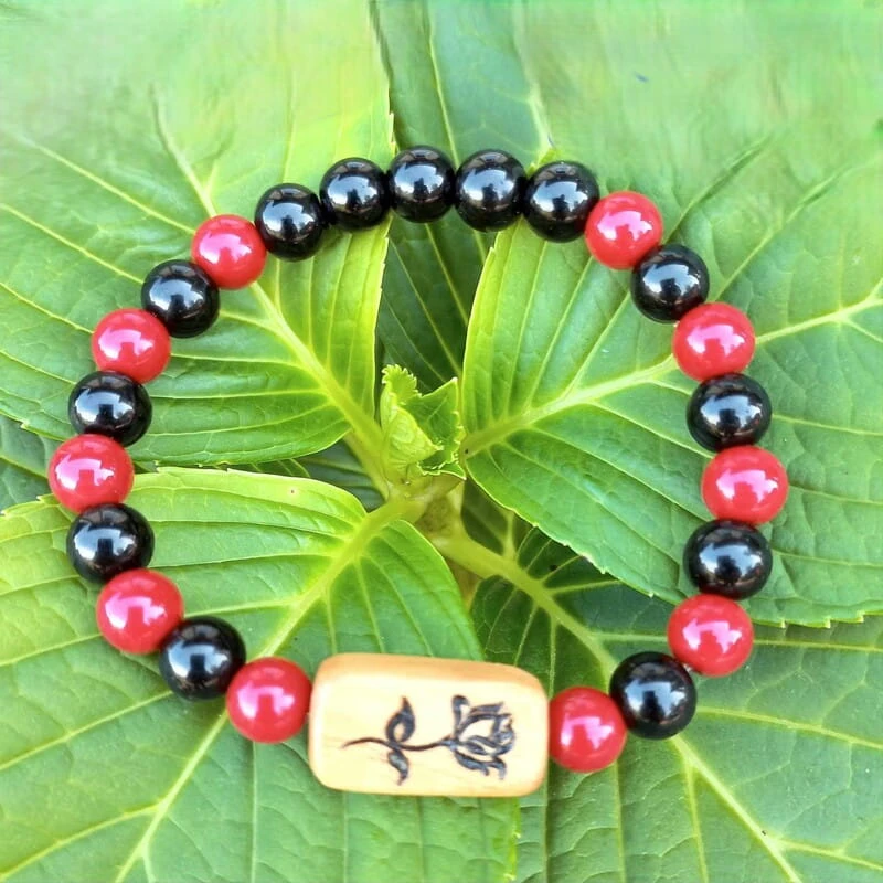 Odkryj piękno natury z naszą elegancką, **ręcznie wykonaną bransoletką**. Łączy ona naturalny **Onyks** z intensywną czerwienią **korala syntetycznego** i ciepłem **drewna oliwnego**. To idealny dodatek dla każdej kobiety, która ceni sobie unikalny styl i **naturalne materiały**. Zdecydowaliśmy się użyć koralików z drewna oliwnego z wypalonym **motywem róży**, aby dodać bransoletce romantycznego uroku i personalizacji.
