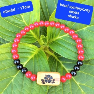 Odkryj piękno natury z naszą elegancką, **ręcznie wykonaną bransoletką**. Łączy ona naturalny **Onyks** z intensywną czerwienią **korala syntetycznego** i ciepłem **drewna oliwnego**. To idealny dodatek dla każdej kobiety, która ceni sobie unikalny styl i **naturalne materiały**. Dzięki temu, że każdy koralik jest wyjątkowy, Twoja **bransoletka z grawerem kwiatka** będzie jedyna w swoim rodzaju.