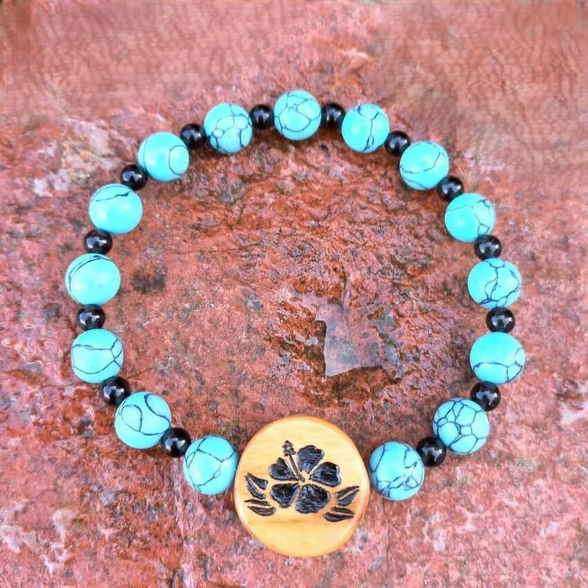 Odkryj piękno natury z naszą elegancką, **ręcznie wykonaną bransoletką**. Łączy ona kamienie naturalne – **turkmenit** (niebieski) i **onyks** (czarny) – z ciepłem **drewna oliwnego**. Każdy kamień i koralik jest unikalny, co sprawia, że Twoja bransoletka jest jedyna w swoim rodzaju. Zdecydowaliśmy się użyć drewnianego koralika z wypalonym **motywem kwiatka**, aby dodać całości naturalnego uroku i delikatności.