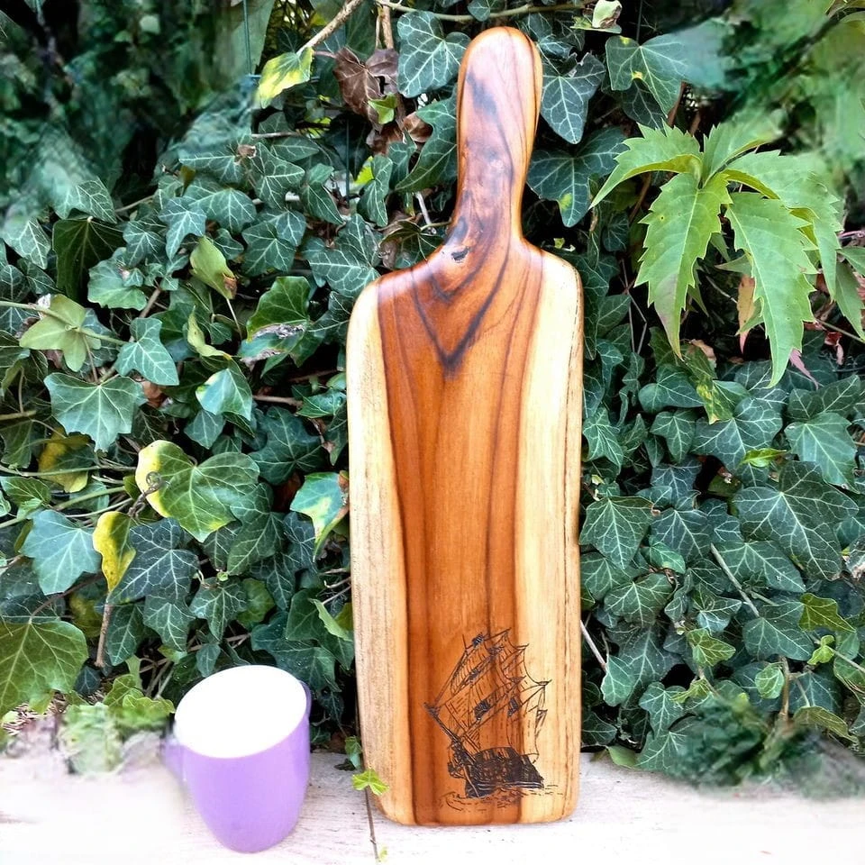 Wprowadź do swojej kuchni i salonu luksusowy akcent dzięki naszej wyjątkowej, **ręcznie wykonanej desce** z egzotycznego **drewna tekowego**. Ta funkcjonalna i dekoracyjna deska o wymiarach **49 x 14 cm** to idealny sposób na stylowe podawanie serów, wędlin i innych przystawek. Unikalny, wypalony **wzór żaglowca** dodaje jej niepowtarzalnego charakteru, czyniąc ją idealnym **prezentem dla każdego pasjonata żeglarstwa** i morskich podróży. Deska może również służyć jako piękna ozdoba kuchni, gdy nie jest używana.