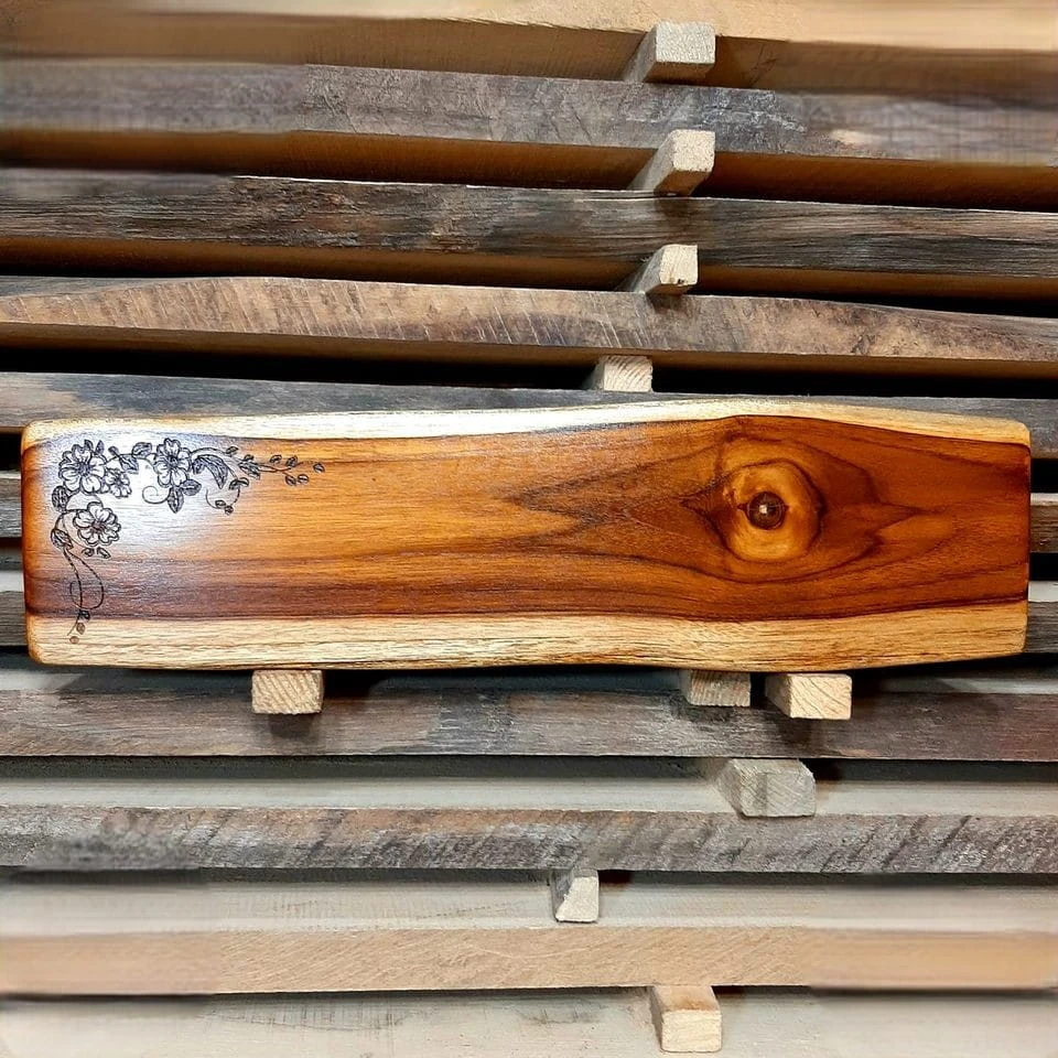 Wnieś do swojej kuchni odrobinę natury i delikatności z naszą **ręcznie wykonaną deską z drewna tekowego**. To idealne narzędzie do serwowania serów, wędlin i innych przekąsek, które zachwyci Twoich gości. Unikalny, wypalony **motyw kwiatowy** nadaje jej niepowtarzalnego charakteru, dzięki czemu deska może służyć również jako stylowa **ozdoba kuchni** czy salonu.