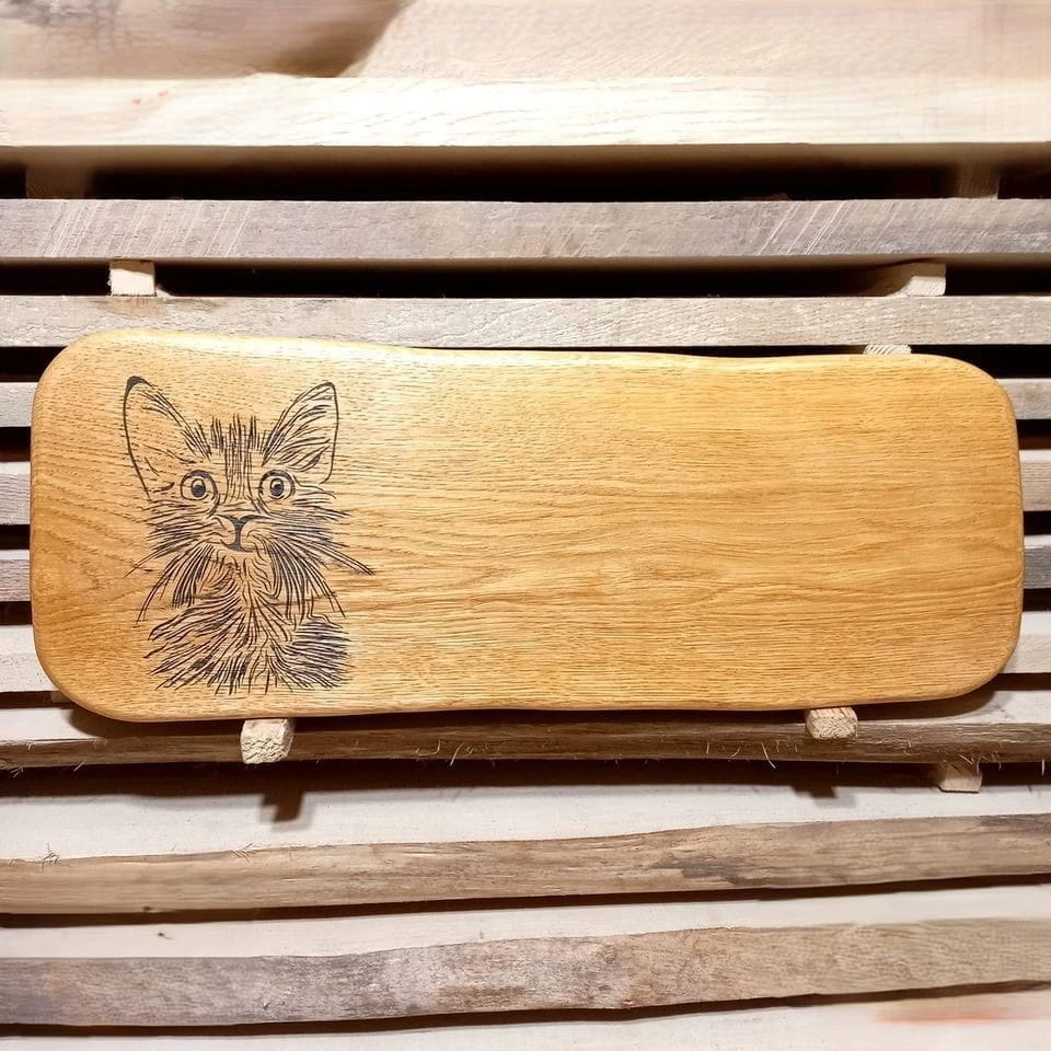 - Wyjątkowy wygląd: Bogaty i niepowtarzalny rysunek usłojenia drewna sprawia, że każda deska dębowa jest jedyna w swoim rodzaju. Grawer z kotem dodaje osobistego charakteru, idealnego dla miłośników tych zwierząt.