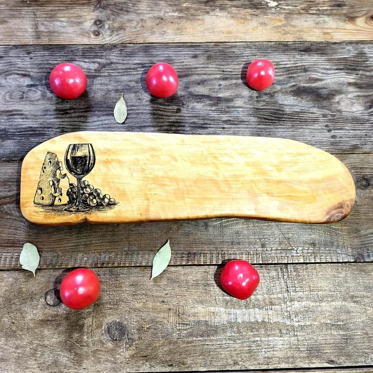 Lewą stronę deski zdobi kunsztowny, trwale wypalony motyw winny. To artystyczne wykończenie podkreśla przeznaczenie deski i nadaje jej niepowtarzalnego, kolekcjonerskiego charakteru.