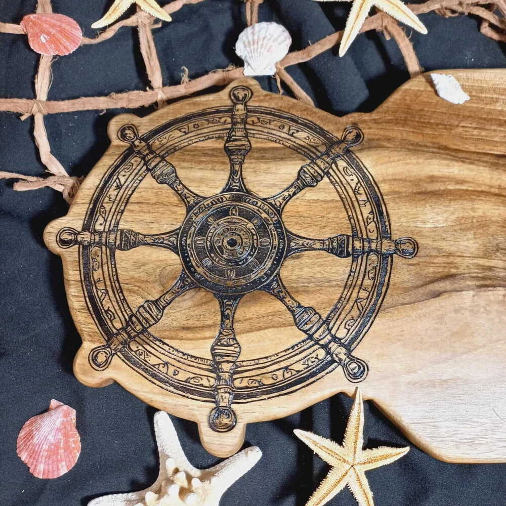 Przekształć serwowanie posiłków w celebrację stylu. Nasza deska z orzecha włoskiego o imponującej długości 62 cm to kwintesencja luksusu i naturalnego piękna. Wykonana z jednego, starannie wyselekcjonowanego kawałka szlachetnego drewna, stanowi idealny fundament pod wykwintne deski serów, tapas czy wędlin. Dzięki unikalnemu, ręcznie wypalonemu motywowi marynistycznemu (koło sterowe), deska staje się centralnym punktem dekoracyjnym każdej jadalni.