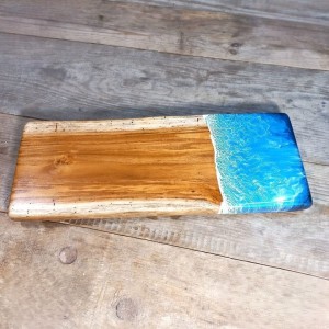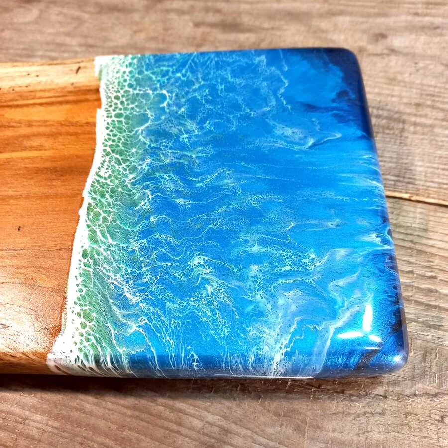 Ta ręcznie wykonana deska z egzotycznego **drewna tekowego** to idealny wybór do podawania serów, wędlin i przekąsek. Unikalny wzór **morskiej fali z żywicy** sprawia, że deska jest nie tylko praktycznym naczyniem, ale również oryginalną ozdobą kuchni. Produkt jest zaimpregnowany preparatem z atestem do kontaktu z żywnością.