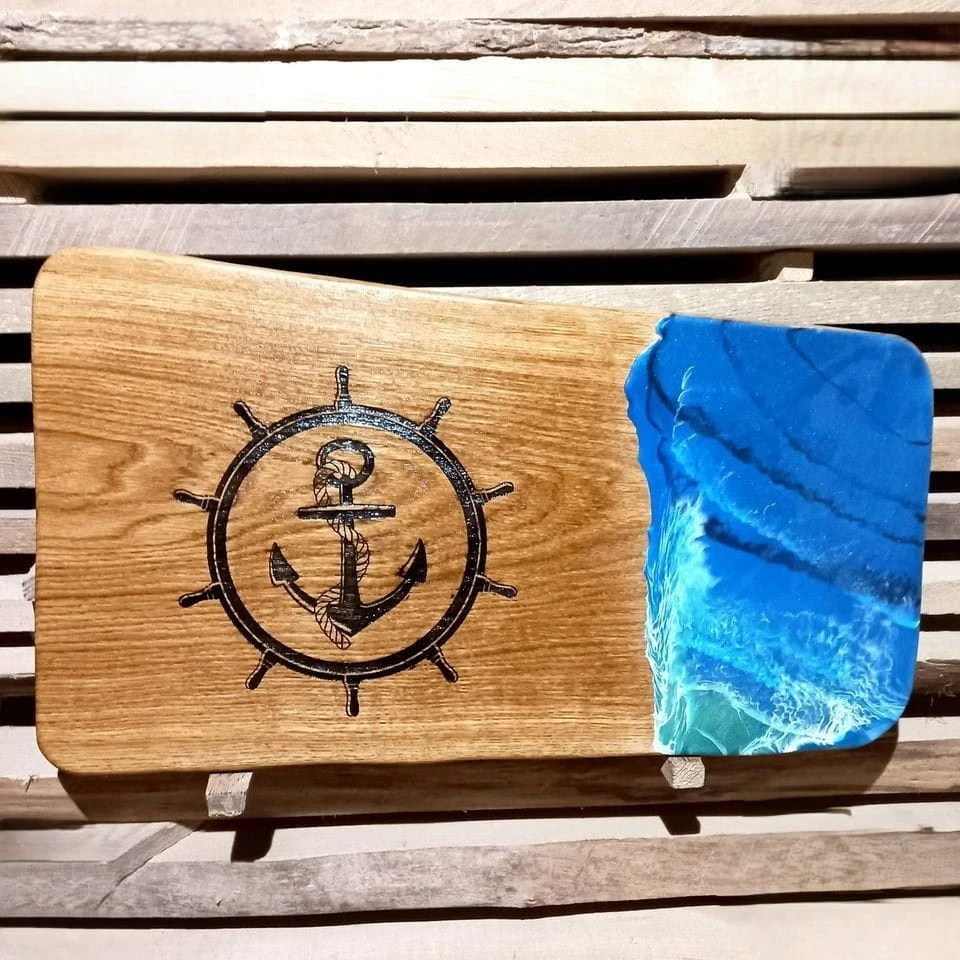 Przedstawiamy ręcznie wykonaną **deskę z drewna dębowego**, która nada Twojemu wnętrzu unikalnego, **marynistycznego charakteru**. Idealna do eleganckiego podawania **serów, wędlin i innych przystawek**. Deska została starannie zaimpregnowana preparatem z **atestem do kontaktu z żywnością**, gwarantując pełne bezpieczeństwo. W wolnej chwili może służyć jako **ozdoba kuchni** lub salonu, a dzięki wypalonemu wzorowi z **kołem sterowym, kotwicą i falami**, poczujesz się jak na pokładzie statku.