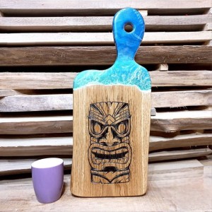 Niepowtarzalne zdobienie żywicą imituje głębię oceanu i fale morskie, a grawer hawajskiej maski dodaje jej egzotycznego charakteru. To idealna taca do podawania przekąsek, która natychmiast przyciąga wzrok i staje się centralnym punktem stołu.