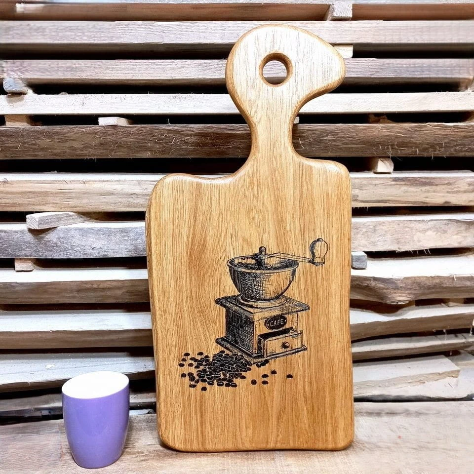 Luksusowa Duża Dębowa Deska do Serwowania z Unikatowym Grawerem Młynka do Kawy