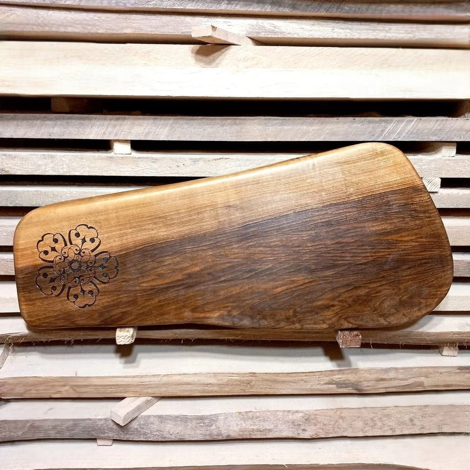 Ta masywna **deska do serwowania serów i wędlin** to centralny punkt każdego stołu. Ręcznie wykonana z **drewna orzecha włoskiego**, zachwyca niepowtarzalnym usłojeniem, gdzie ciemnobrązowa twardziel harmonijnie łączy się z jasną bielą. Deska jest idealna nie tylko jako powierzchnia do **krojenia**, ale przede wszystkim jako **deska do przekąsek** (Long-Tail: *luksusowa deska na prezent na parapetówkę*). Dodatkowo, w bocznej części posiada subtelny, wypalony motyw kwiatowy, który sprawia, że pełni rolę **unikatowej ozdoby kuchni** lub jadalni.
