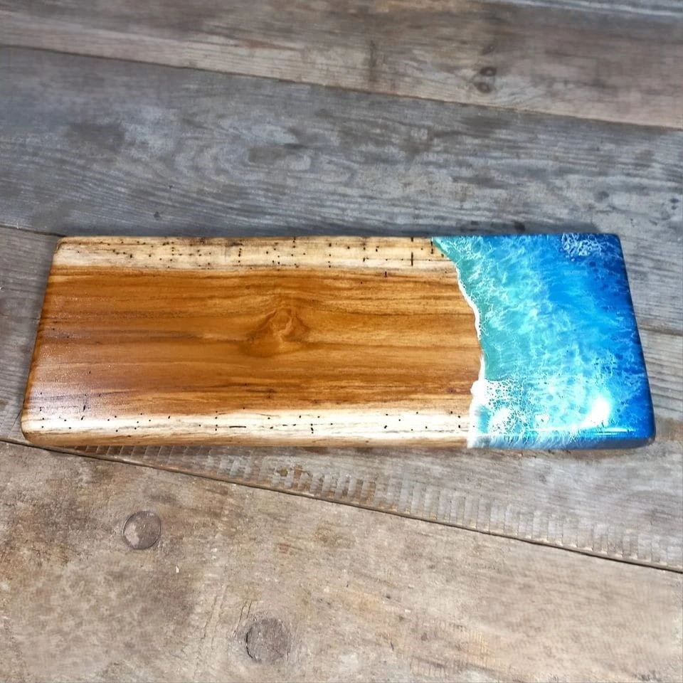 Ręcznie Robiona Deska do Serwowania z Drewna Teak z Artystyczną Żywiczną Falą Morską