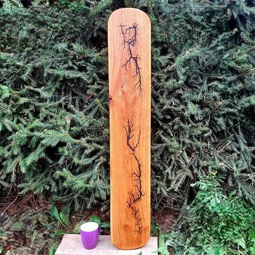 Ta **deska do serwowania** to **ręcznie wykonane arcydzieło Nela Wood**. Łączy wytrzymałość **jesionu** z elektryzującym **wzorem Lichtenberga**.