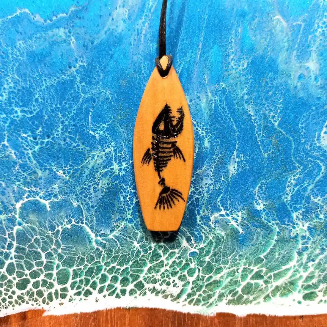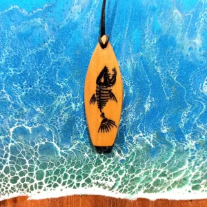 Wisiorek z Drewna Oliwnego – Deska Surfingowa z Grawerem Rybiego Szkieletu